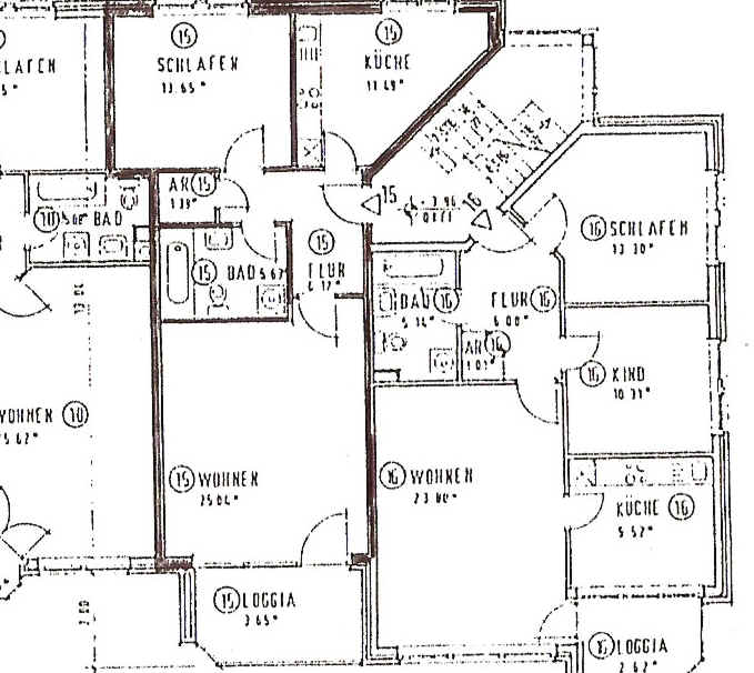 Die Wohnung liegt im DG rechts und hat ca. 57, 21 qm, d. h. ca. Schlafen, ca. 10,43, Küche ca. 6,68, Wohnen, ca. 24,09, Bad, ca. 5,63, Flur, ca. 6,17, Abstellraum unten, ca. 1,39, Loggia ca. 3, 65 ( laut mir vorliegendem Plan ).